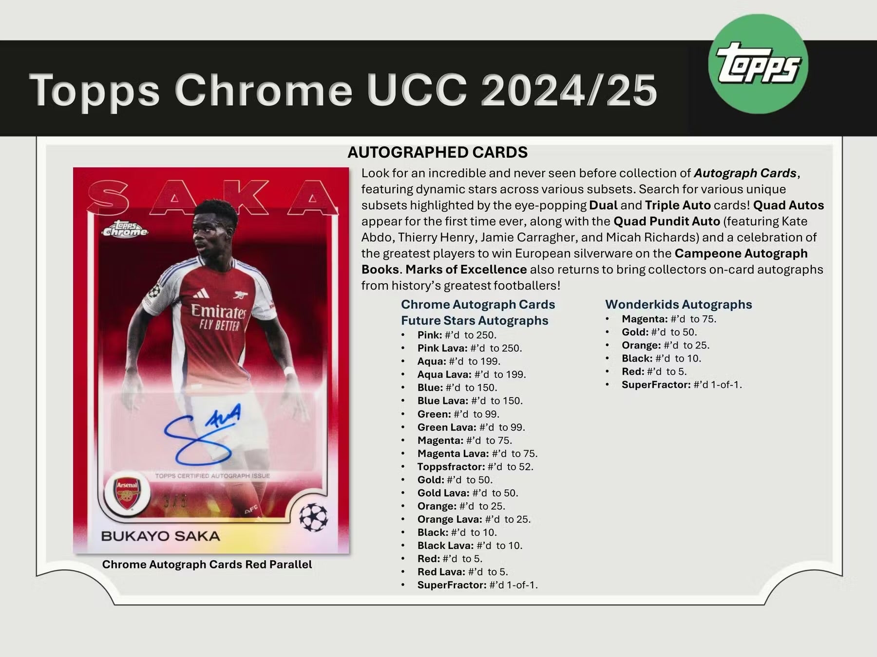 The hits ramp up again this year, as Chrome Quad Autograph Cards make their debut. Wonderkids Autographs feature ink from some of the game's brightest young talents, while Campeone Autograph Books celebrate some of the greatest foursomes to capture European silverware.
