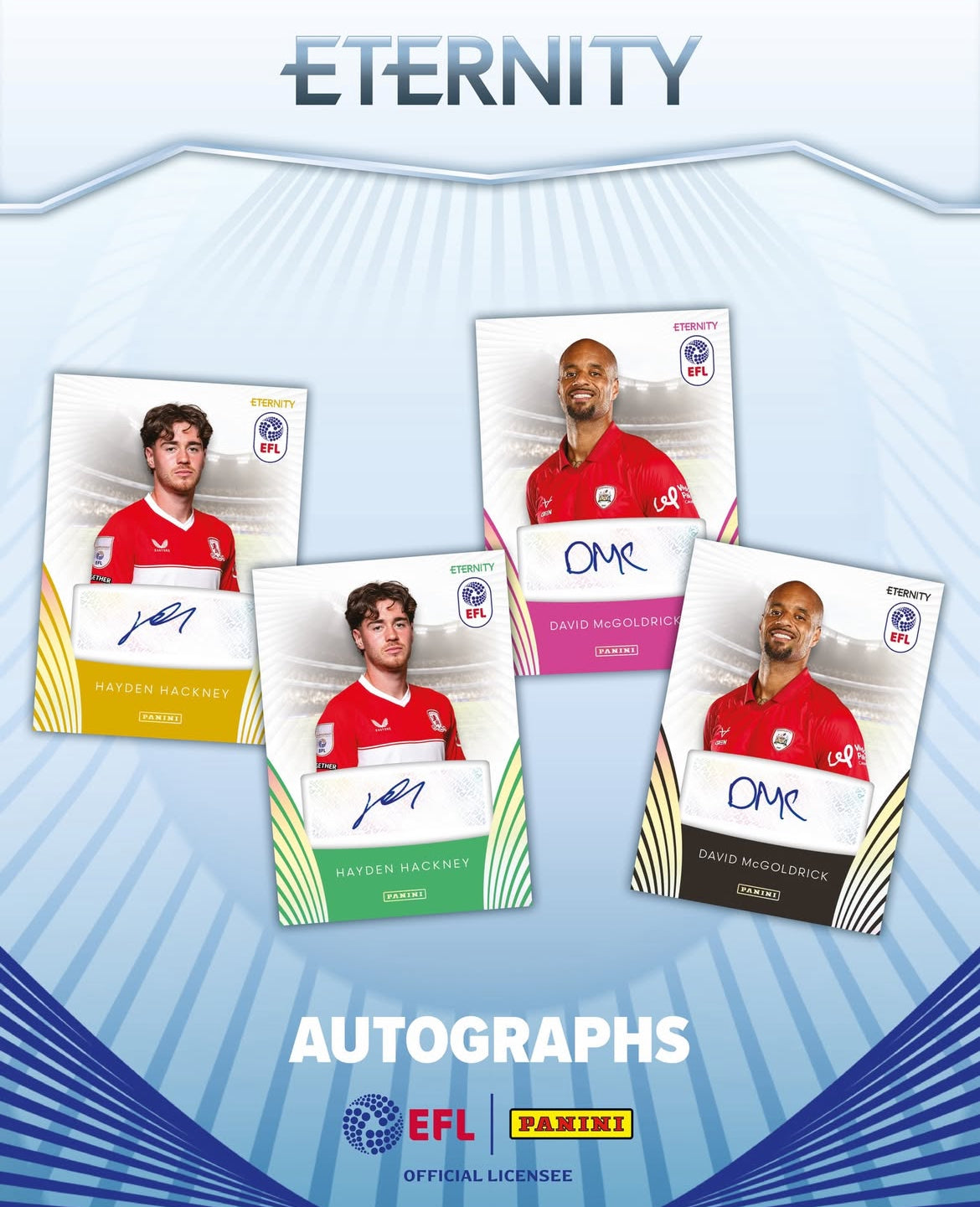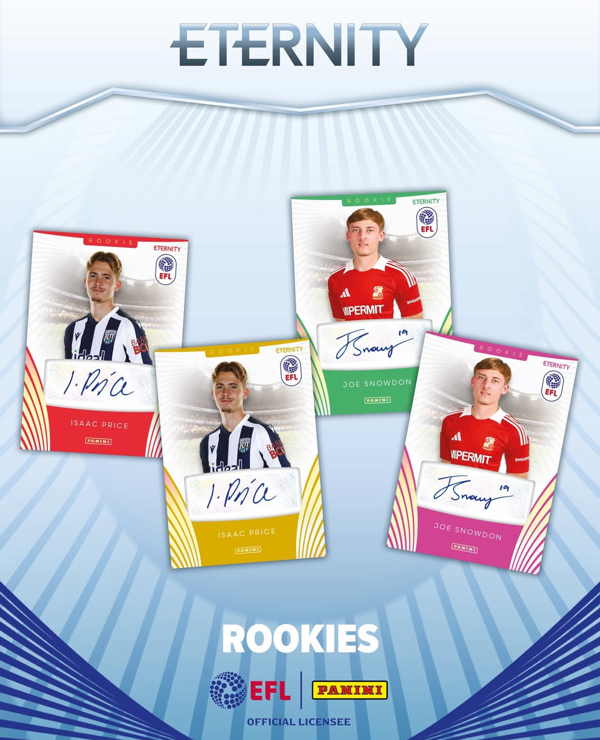 Panini are excited to announce the launch of the Panini Eternity EFL Collection 2025/26 – a brand-new hobby collection for 2026! This limited set features a 240-card base and insert set, as well as 110 player autograph cards including current players, rookies and legends from the EFL Championship, League One and League Two.